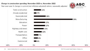 The survey—“A Construction Market in Transition: The 2024 Construction Hiring and Business Outlook”—included 1,293 responses submitted Nov. 9 to Dec. 8. Respondents were asked whether the dollar value of projects they compete for would be higher or lower in 2024. The net reading (percentage of respondents expecting a higher dollar value less the percentage expecting a lower value) was positive for 14 out of 17 project types.