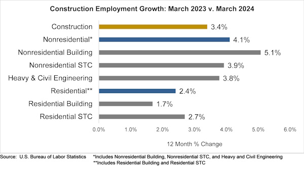 “As always, the jobs report was not completely positive,” says Basu. “Those in search of lower inflation and interest rates will not be comforted by this release. While economywide year-over-year wage growth softened to 4.1 percent in March, the monthly wage growth figure suggested a pace of compensation growth that will render it difficult for the Federal Reserve to substantially reduce interest rates in 2024. The notion that interest rates will remain higher for longer remains firmly in place, which means that project financing costs will likely be an ongoing issue for construction demand, especially in privately financed segments, for the foreseeable future.”