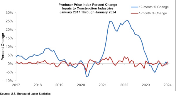 Construction input prices increased 1 percent in January compared to the previous month, according to an Associated Builders and Contractors (ABC) analysis of the U.S. Bureau of Labor Statistics’ Producer Price Index (PPI) data. Nonresidential construction input prices increased 0.9 percent for the month.