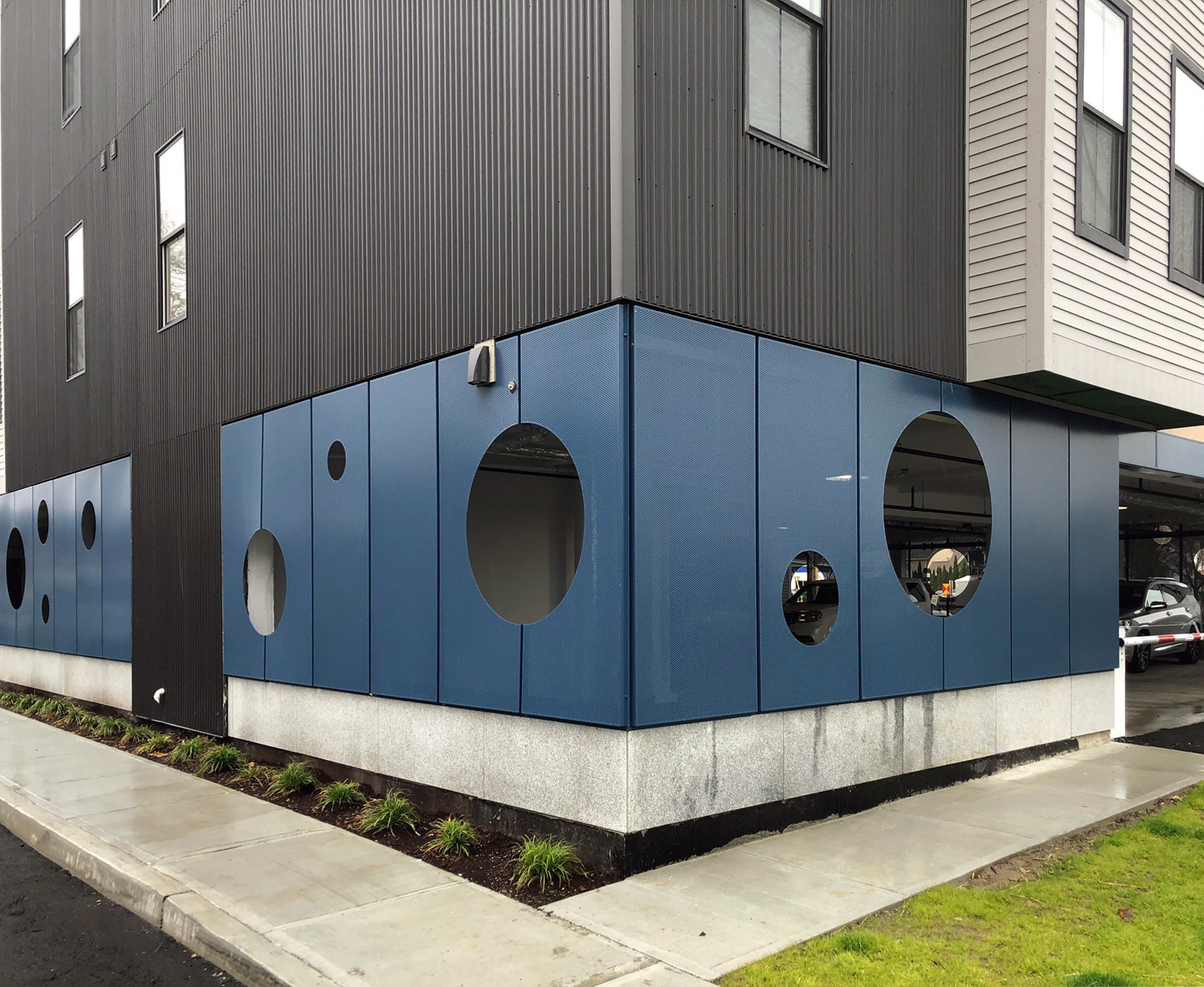 For the accents category, 3 Maple in Essex Junction, Vt., took first place. G4 Design Studios, the architectural firm on this project, chose custom perforated 0.125 aluminum plate panels in Regal Blue. The larger holes in the panels, which were cut by ATAS, created ventilation and visual interest to the lower garage level of this building. The panels were purchased through ABC Supply Co. and installed by the general contractor, BlackRock Construction.