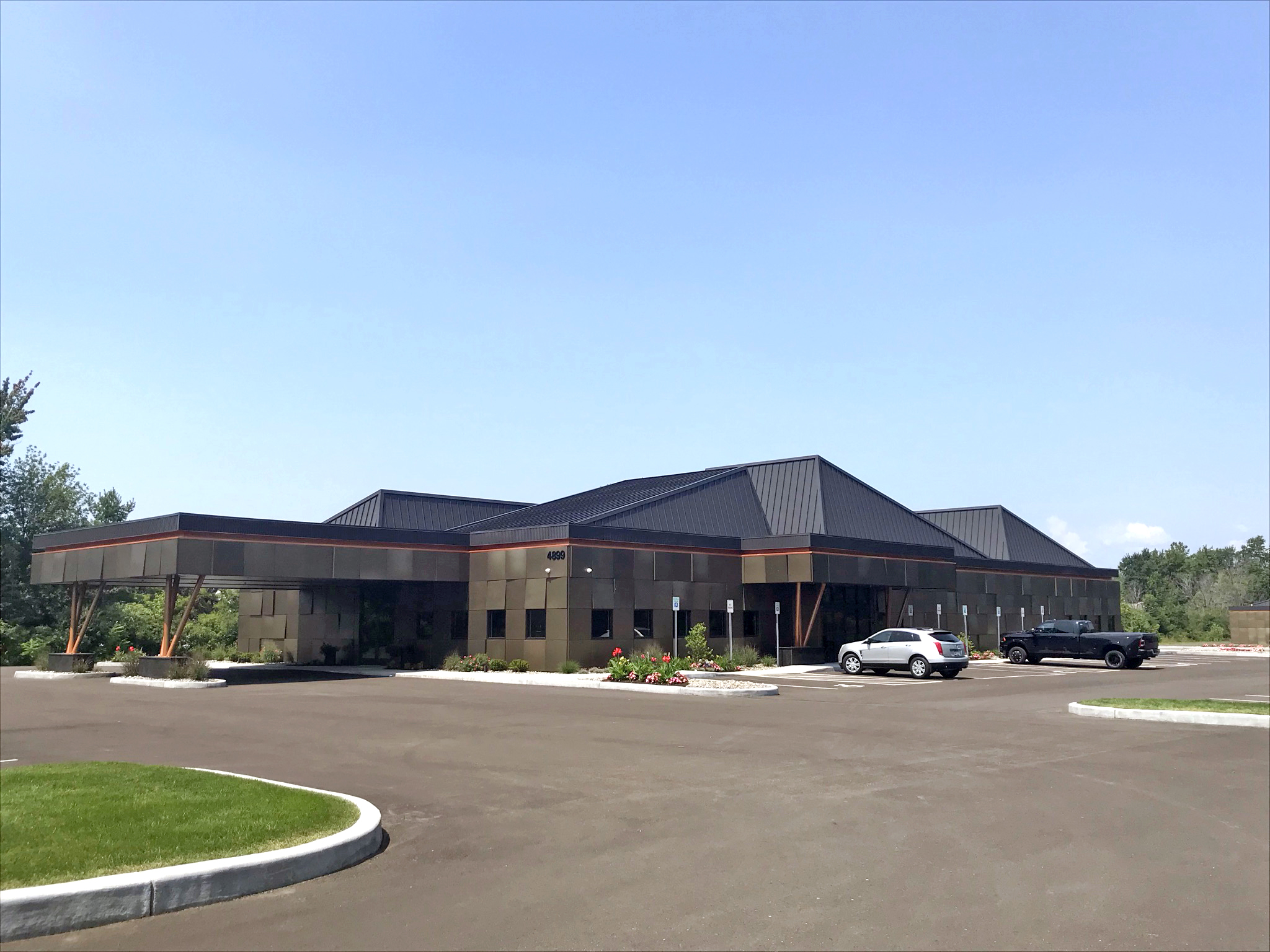 The Farone & Son Inc. Funeral Home in Liverpool, N.Y., received the first-place honors for commercial roofs. Dutch Seam panels in Classic Bronze 0.032 aluminum were used on this project. The panels had an embossed surface with stiffening ribs and were 15 inches wide with a seam height of 1-1/2 inch. The building was designed by Robert C. Abbott Jr.-Architect, and the roof panels were installed by Eastern Contractors. The panels were purchased through ABC Supply Company.