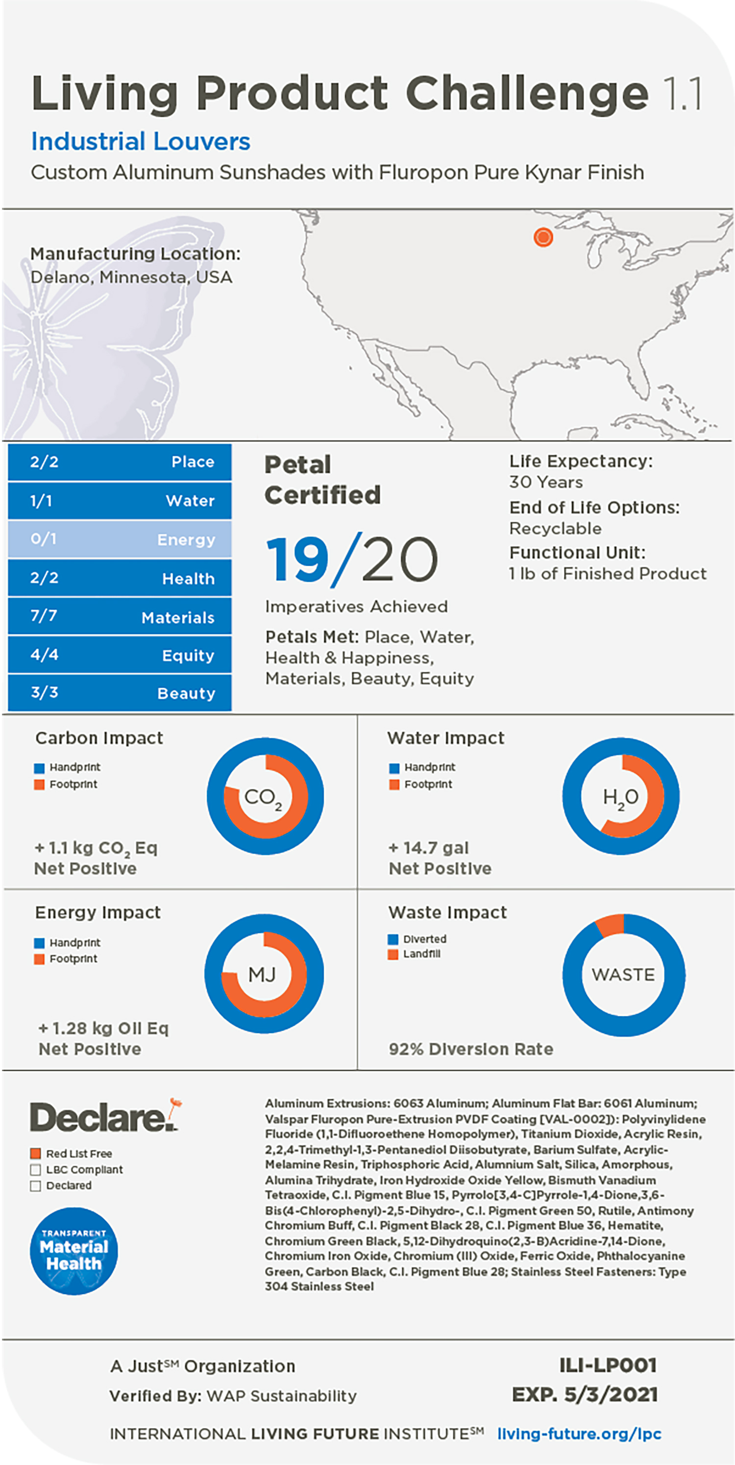 Industrial Louvers Inc. (ILI) is proud to announce it is the first metals manufacturer to receive Petal Certification for its painted sunshade products through the International Living Future Institute’s (ILFI) Living Product Challenge (LPC). ILI’s painted sunshades earned 19 of 20 Imperatives in six out of seven Petals.