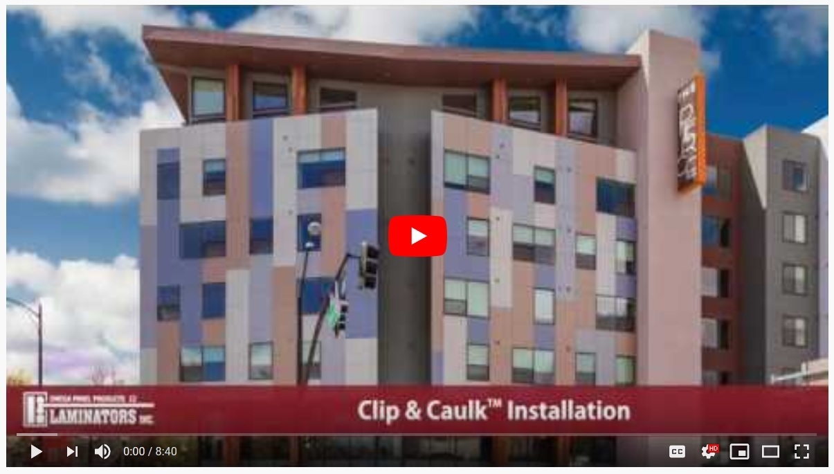 Laminators’ back-drained and ventilated, field-fabricated installation systems (one-piece, tight-fit molding; clip and caulk) use aluminum extrusions as sub-framing members to create a 7/8-inch deep cavity behind the panel veneer.