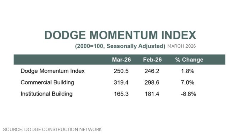 Martin was referring to the recently published Dodge Momentum Index (DMI), which increased 1.8% in March to 250.5 (2000=100) from the downwardly revised February reading of 246.2. Over the month, commercial planning grew by 7.0%, while institutional planning momentum declined by 8.8%.