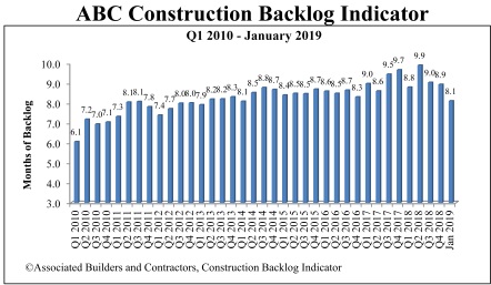 Associated Builders and Contractors reported today that its Construction Backlog Indicator contracted to 8.1 months during January 2019, down 0.8 months or 9.3 percent compared to the fourth quarter 2018 reading of 8.9 months.