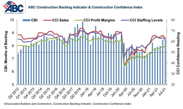 Associated Builders and Contractorsreports today that its Construction Backlog Indicator remained unchanged at 8.5 months in July, according to an ABC member survey conducted July 20-Aug. 2, up 0.7 months from July 2020.
