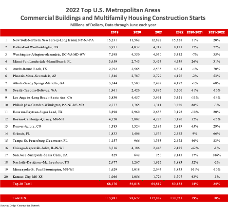 During the first six months of the year, the value of commercial and multifamily construction starts in the top 20 metropolitan areas of the U.S. increased 24% from 2021, according to Dodge Construction Network.