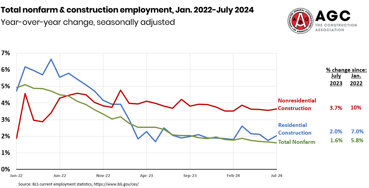 The industry unemployment rate in July, not seasonally adjusted, was 3.9 percent, unchanged from July 2023, and the number of unemployed jobseekers with construction experience totaled 420,000, an increase of 10,000 (2.4 percent) y/y.