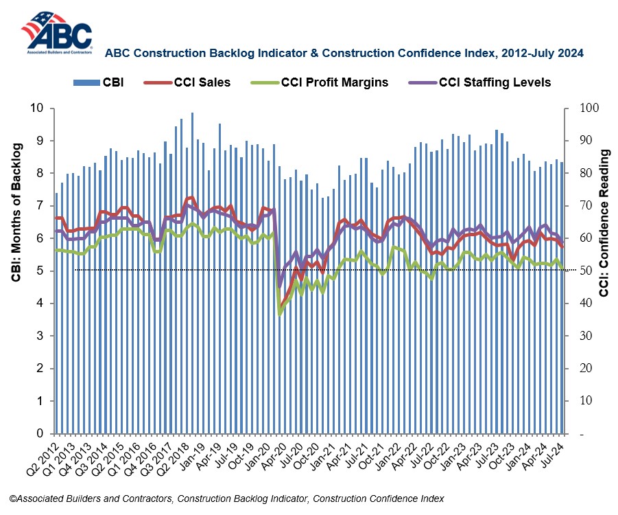 Associated Builders and Contractors (ABC) reported its Construction Backlog Indicator held steady at 8.4 months in July, according to an ABC member survey conducted from July 22 to Aug. 6. The reading is down 0.9 months from July 2023.