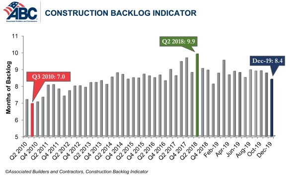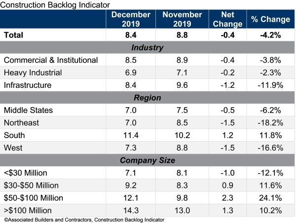 Associated Builders and Contractors (ABC) reported its Construction Backlog Indicator fell to 8.4 months in December 2019, a 4.2% decline from November’s reading. This appears to be due primarily to seasonal factors.