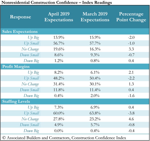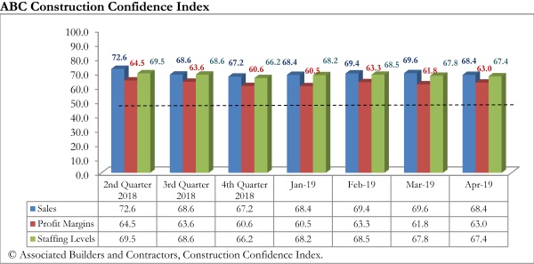 Despite ongoing concerns about skilled worker shortages and volatile materials prices, construction executives remain bullish about the prospects for the nonresidential construction sector, according to Associated Builders and Contractors’ April 2019 Construction Confidence Index released today.