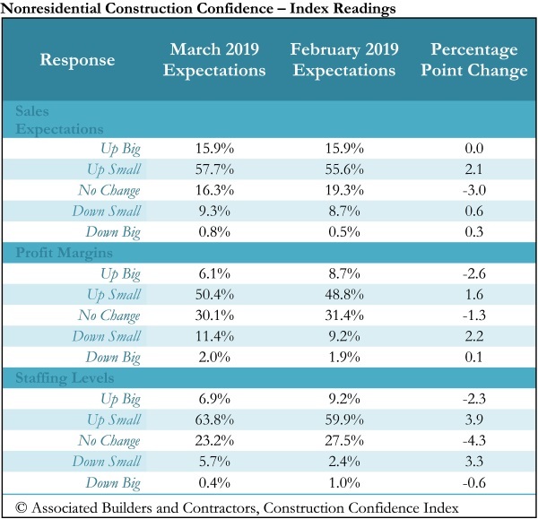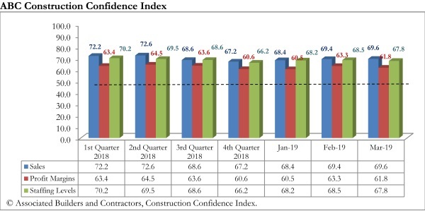 Construction industry leaders remained upbeat with respect to nonresidential construction prospects in March 2019, according to the latest Construction Confidence Index released today by Associated Builders and Contractors.