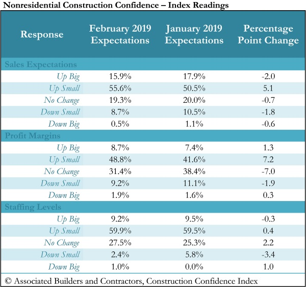 Construction industry leaders remained confident regarding nonresidential construction prospects in February 2019, according to the latest Construction Confidence Index (CCI) released by Associated Builders and Contractors today.