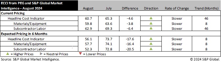 Engineering and construction costs increased in August, according to the Engineering and Construction Cost Indicator from PEG and S&P Global Market Intelligence. The headline Engineering and Construction Cost Indicator, a leading indicator measuring wage and material inflation for the engineering, procurement, and construction sector, declined 4.6 points to 60.7 in August. The sub-indicator for materials and equipment costs fell 3.8 points to 59.8 while the sub-indicator for subcontractor labor costs moved down to 62.9 in August from 69.3 in July.