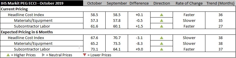 U.S. construction costs increased in October, according to IHS Markit and the Procurement Executives Group (PEG). The headline IHS Markit PEG Engineering and Construction Cost Index registered 58.5 in October, marking the 36th consecutive month that construction costs have increased. Both the materials and equipment and subcontractor labor indexes indicated continued price increases with readings of 57.3 and 61.6.