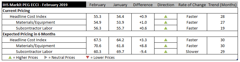 Construction costs continued to increase in February, according to IHS Markit and the Procurement Executives Group (PEG). The current headline IHS Markit PEG Engineering and Construction Cost Index registered 55.3 this month, a slight uptick from January’s reading of 54.4. Index readings well above 50 for both materials and labor indicate price increases continue to be widespread.