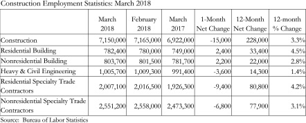 The U.S. construction industry lost 15,000 jobs on net in March, according to an Associated Builders and Contractors (ABC) analysis of data from the U.S. Bureau of Labor Statistics (BLS). This represents a significant reversal from February, when the industry added a post-recession high of 65,000 net new jobs (upwardly revised from +61,000). The construction sector has added 228,000 net new jobs over the past twelve months, which represents a substantial 3.3 percent increase in the number of workers directly employed by the industry.