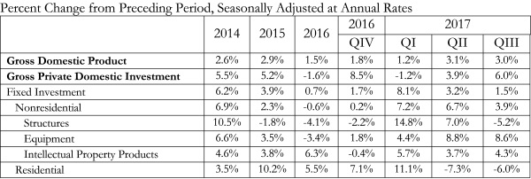 The U.S. economy expanded at an annual rate of 3 percent during the third quarter of 2017, according to Associated Builders and Contractors’ analysis of gross domestic product (GDP) data released today by the Bureau of Economic Analysis. Nonresidential fixed investment, a category of GDP associated with nonresidential construction activity, also contributed to growth as it expanded at an annual rate of 3.9 percent.