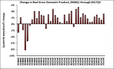 The third quarter’s overall performance follows a second quarter during which the economy expanded at roughly the same annual rate (3.1 percent). The back-to-back expansion represents the largest gains in two consecutive quarters registered since 2014. A 2.4 percent increase in consumer spending buoyed third quarter growth, while nonresidential fixed investment’s growth primarily was driven by investment in equipment and intellectual property, as opposed to structures. It also likely was boosted by the major hurricanes that hit parts of the United States during the quarter, which served to increase inventory accumulation. Inventory accumulation added 0.7 percentage points to growth during the quarter.