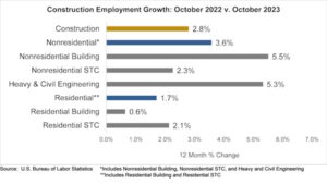 The construction industry added 23,000 jobs in October, according to an Associated Builders and Contractors (ABC) analysis of data released by the U.S. Bureau of Labor Statistics. On a year-over-year basis, industry employment has increased by 219,000 jobs, an increase of 2.8 percent.