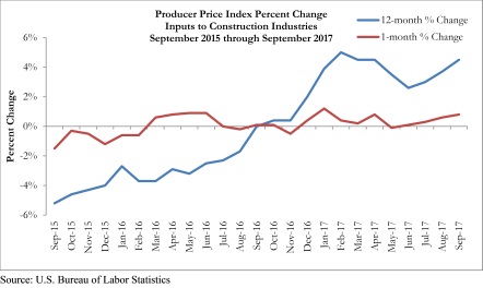 “Recent storms have also likely contributed to rising materials prices,” said Basu. Given that rebuilding efforts are ongoing, this is likely to have some influence over materials prices for months to come. The ongoing synchronized global economic recovery is also likely to produce at least stable materials prices during the months ahead.” Moreover, global commodity prices have firmed, in part because construction activity in China is expanding once again. The result is oil prices hovering around $50/barrel and natural gas prices above $3 per million BTU.