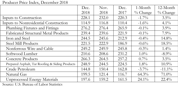 Construction input prices declined 1.7 percent in December on a month-over-month basis yet are 3.5 percent higher than the same time last year, according to an Associated Builders and Contractors analysis of U.S. Bureau of Labor Statistics data released today. In December, nonresidential construction prices fell 1.6 percent but are up 4.1 percent compared to one year ago.