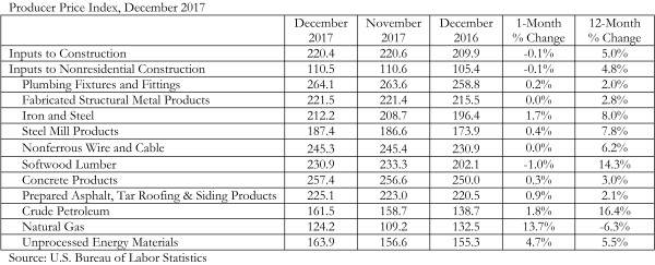 “Despite December’s reprieve from rising inflationary pressures, many economists expect inflation to become more apparent as 2018 proceeds,” said Basu. “Recently enacted federal tax cuts stand to supercharge the economy, which should translate into more construction starts later this year and into 2019. At the same time, growth in Europe and in much of Asia remains solid. India’s economy is expected to expand more than 7 percent this year, and China’s by more than 6 percent. The upshot is that December’s data may come to represent an exception during an increasingly inflationary period.”