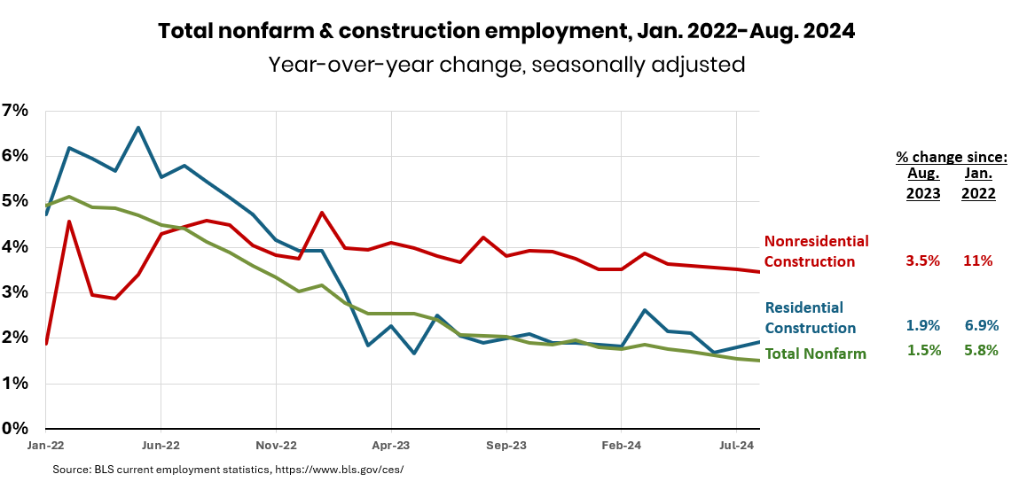 Residential construction employment rose by 5,600 in August (4,800 at residential building firms and 800 at specialty contractors) and 63,100 (1.9 percent) y/y. Nonresidential construction employment increased by 28,300 for the month (800 at building firms, 14,000 at specialty trade contractors, and 13,500 at heavy and civil engineering construction firms) and 164,500 (3.5 percent) y/y. The seasonally adjusted average hourly earnings (AHE) for production and nonsupervisory employees rose 4.1 percent y/y for the total private sector, 3.8 percent for all construction (i.e., most craft and office workers), and (through July) 4.6 percent for nonresidential building firms, 3.5 percent for heavy and civil engineering construction firms, and 9.7 percent for residential building firms.
