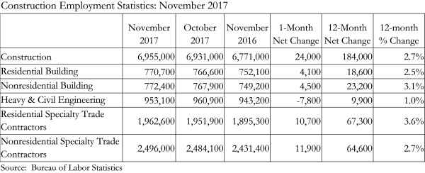The construction industry unemployment rate increased by 0.5 percentage points and now stands at 5 percent. While this increase is likely due to seasonal factors, an increase in the construction industry unemployment rate is not necessarily a bad indicator given ongoing skilled labor shortages. The unemployment rate for all non-farm industries—a figure that is seasonally adjusted—remained unchanged at 4.1 percent in November and remains at a 17-year low.