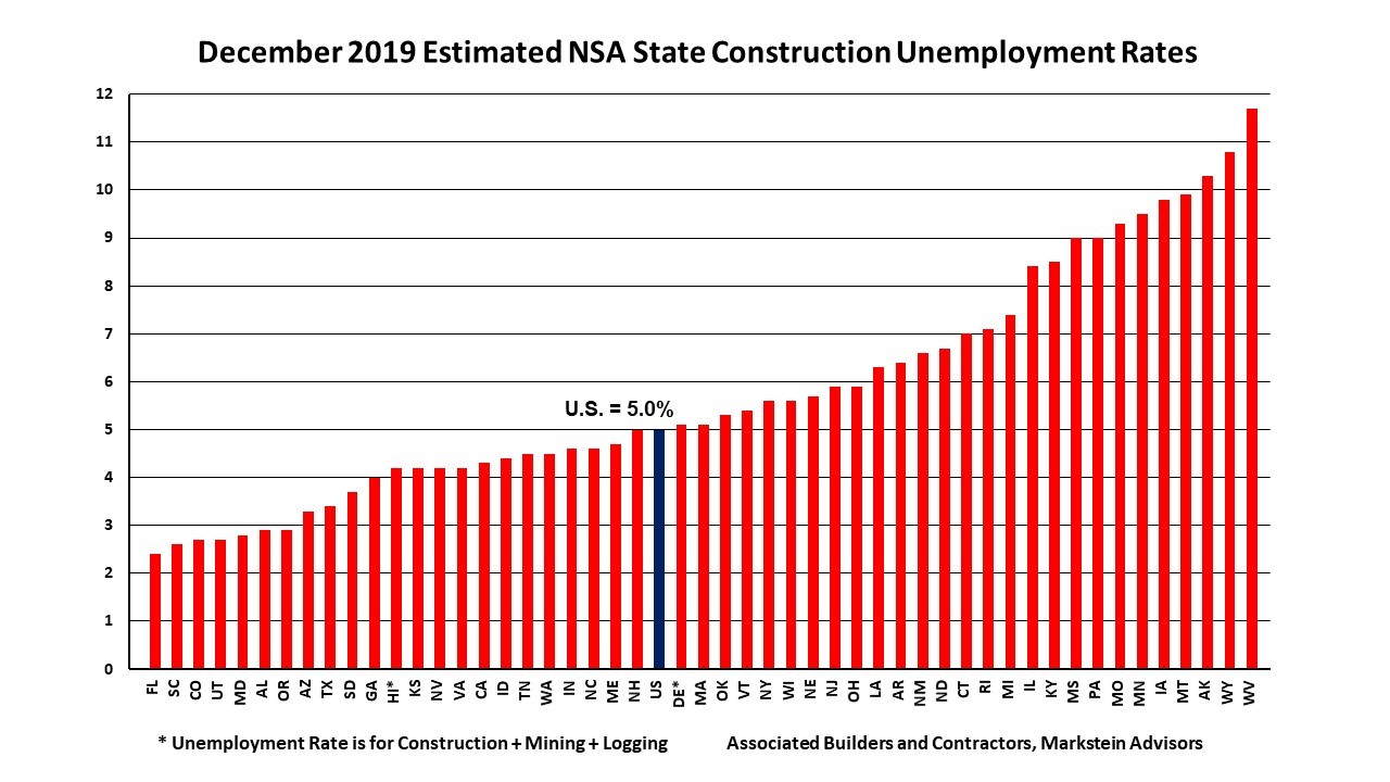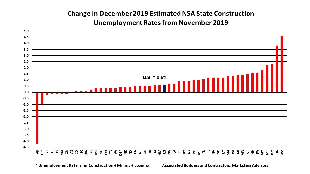 In December 2019, estimated not seasonally adjusted construction unemployment rates fell nationally and in 24 states, rose in 25 states and were unchanged in one state (New York) on a year-over-year basis, according to an analysis of U.S. Bureau of Labor Statistics (BLS) data released by Associated Builders and Contractors (ABC).