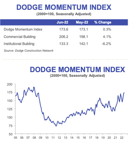 “A new cyclical high in the Momentum Index is a sign that developers feel that projects still have hope of moving forward, despite concerns of an impending economic slowdown. However, this sentiment will be tested in the months to come as higher interest rates eat away at business and consumer confidence,” said Richard Branch, chief economist for Dodge Construction Network.