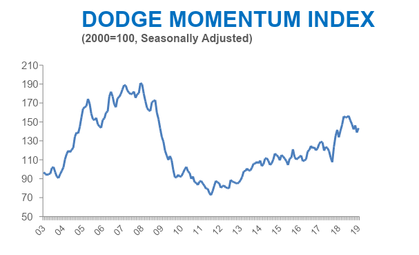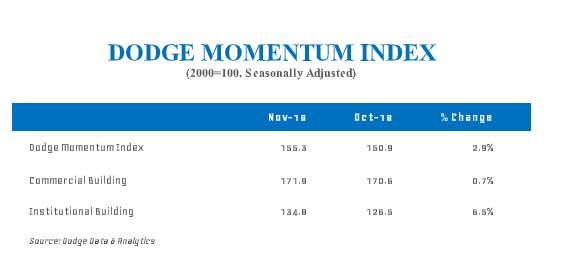 In November, Dodge Data and Analytics’ Dodge Momentum Index moved 2.9% higher to 155.3 from the revised October reading of 150.9 (2000 equals 100). The increase in November was the result of a 6.5% increase in the institutional component, while the commercial component moved 0.7% higher.