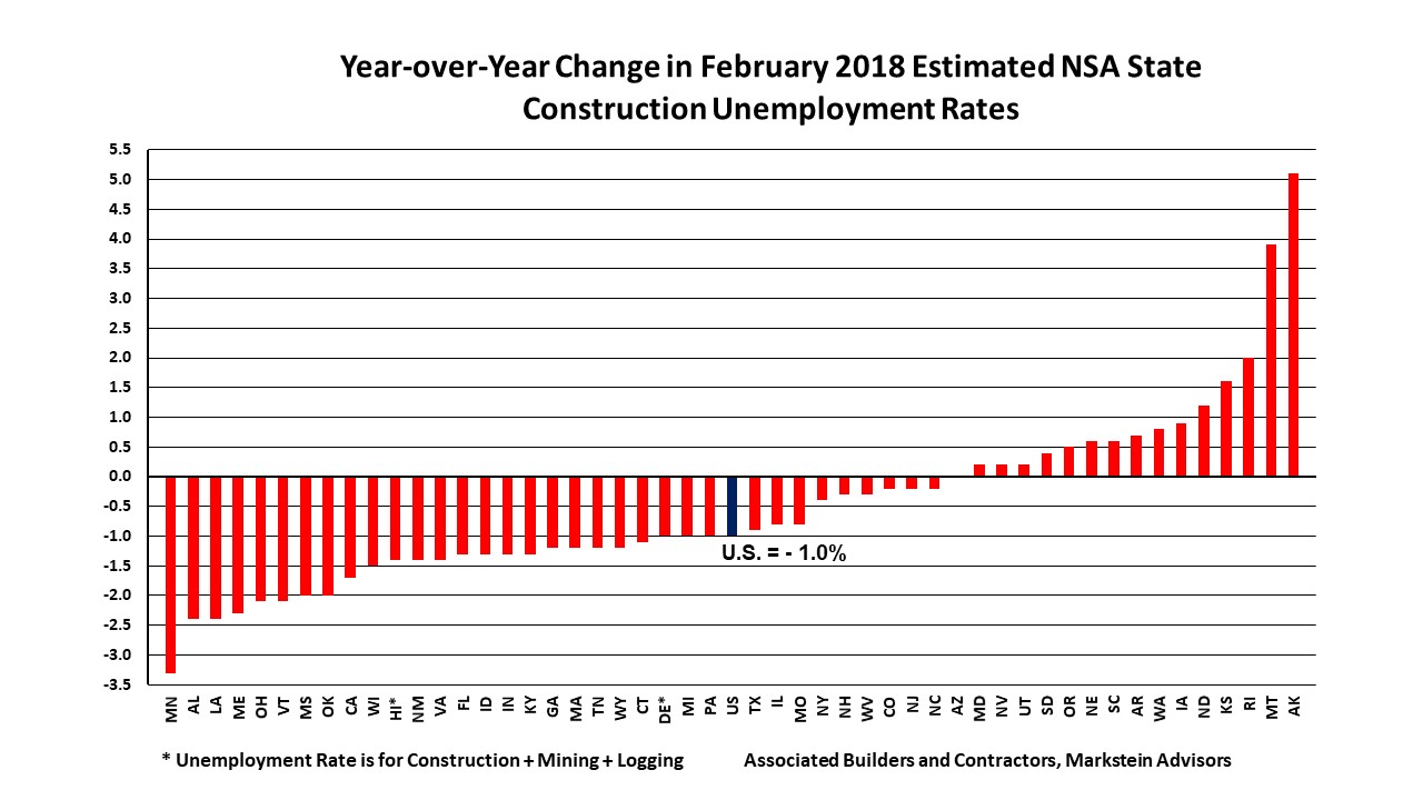 The February 2018 not seasonally adjusted (NSA) national construction unemployment rate was 7.8 percent, down 1 percent from February 2017 and the lowest national February rate on record, according to an analysis of U.S. Bureau of Labor Statistics (BLS) data released today by Associated Builders and Contractors (ABC). Estimated construction unemployment rates were down in 34 states on a year-over-year basis, unchanged in one state (Arizona) and up in 15 states.