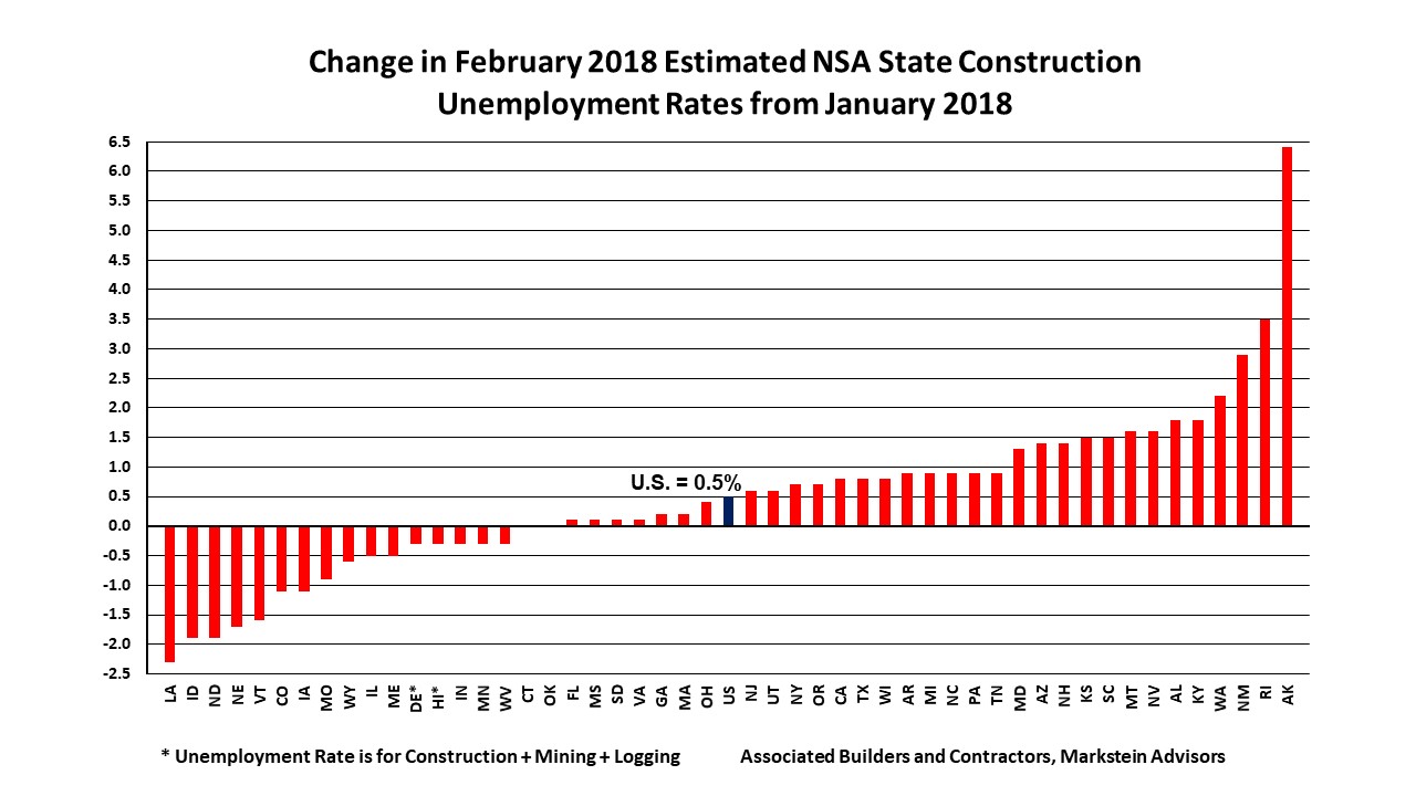 From the beginning of the data series in January 2000 through February 2017, the national NSA construction unemployment rate from January to February has increased 11 times, decreased six times and been unchanged once (February 2003). The rate for February 2018 adds another reading to the increase side, up 0.5 percent. Among the states, 32 were up, 16 were down and two (Connecticut and Oklahoma) were unchanged from January.