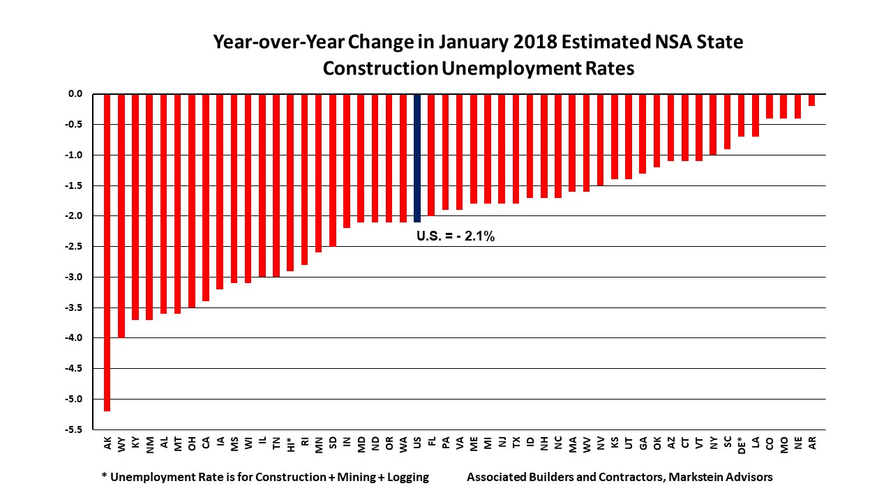 Continued strength in construction resulted in a 7.3 percent January 2018 not seasonally adjusted (NSA) national construction unemployment rate, down 2.1 percent from January 2017 and the lowest national January rate on record, according to an analysis of U.S. Bureau of Labor Statistics (BLS) data released today by Associated Builders and Contractors (ABC). Further, estimated construction unemployment rates were down in all 50 states on a year-over-year basis.