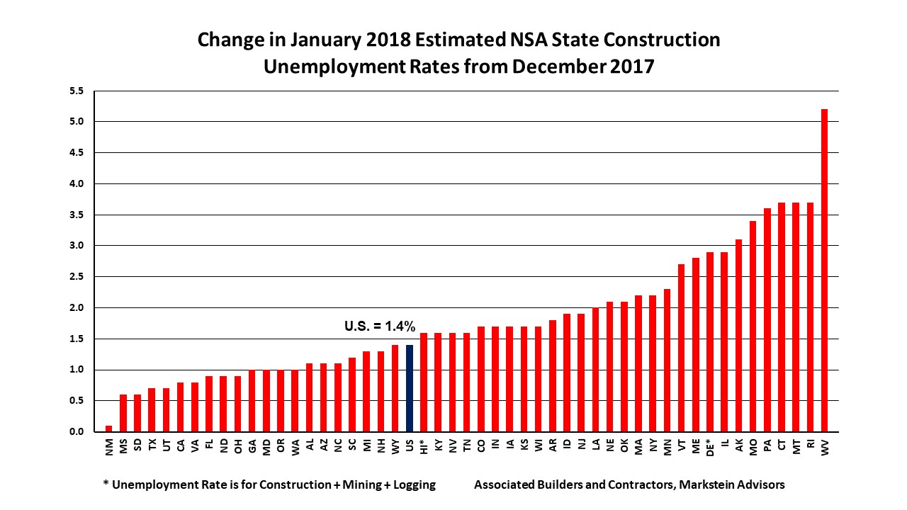 From the beginning of the data series through 2017, the monthly change in the national NSA construction unemployment rate from December to January has always been an increase. The rate for January 2018 was no different, increasing 1.4 percent from December. All the states had increases as well.”