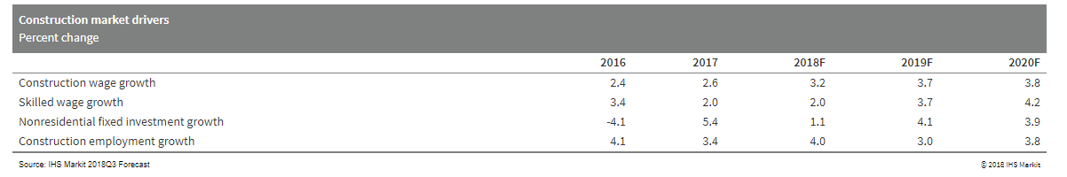 • Construction spending outlook: An improving manufacturing economy will provide some support to residential spending in the region, which will grow an average of 1.0 percent per year between 2018 and 2020. Infrastructure will experience the strongest growth at 2.0 percent per year over the same period.