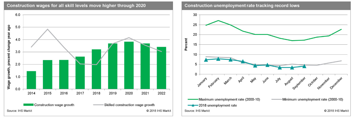 Wages in the construction industry will continue to move higher, with lower-skilled workers experiencing the strongest growth. Minimum wage increases on both coasts are helping to increase the floor for unskilled wages. Average construction wages will grow 3.2 percent in 2018, compared with 2.0 percent for skilled workers. Slowing nonresidential fixed investment combined with an influx of less-productive workers will keep skilled wages subdued in 2018. However, expect stronger demand in nonresidential spending in 2019 and 2020 to fuel an acceleration in skilled wages.