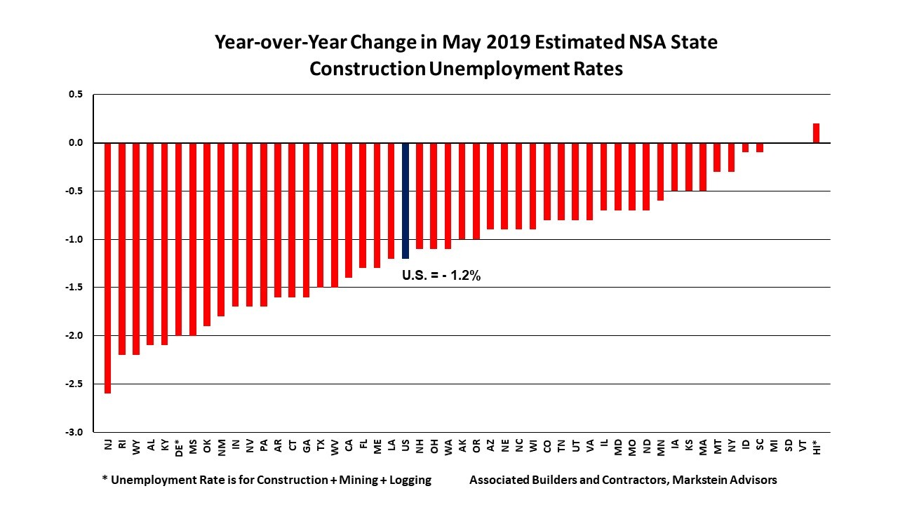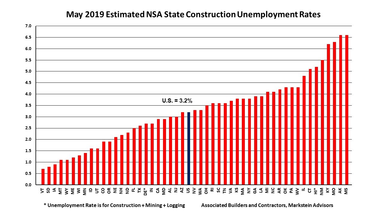 The construction industry employed 203,000 more workers nationally compared to May 2018, pushing the May 2019 national NSA construction unemployment rate down 1.2 percent, from 4.4 percent to 3.2 percent, according to BLS numbers.