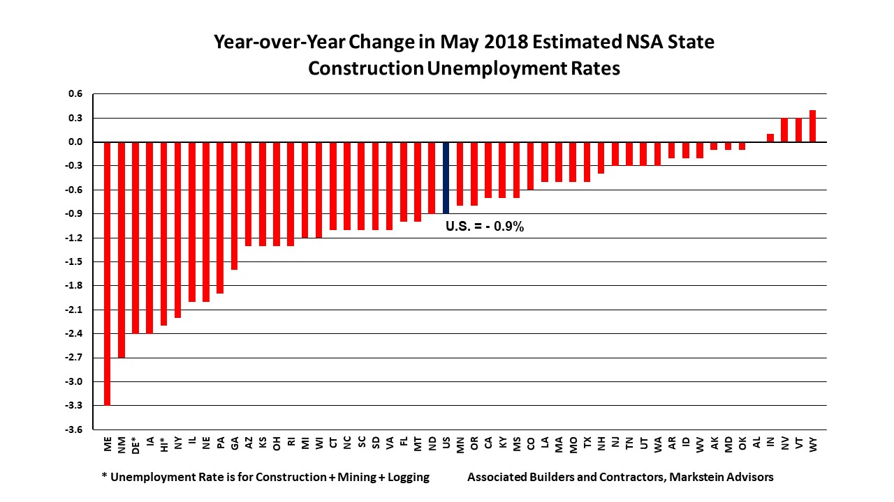 Estimated May construction unemployment rates fell in 45 states on a year-over-year basis, rose in four states and were unchanged in one state (Alabama), according to an analysis of U.S. Bureau of Labor Statistics data released today by Associated Builders and Contractors.