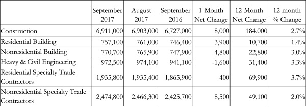 The national construction industry added 8,000 net new jobs on a seasonally adjusted basis in September, according to an analysis by Associated Builders and Contractors (ABC) of today’s release from the U.S. Bureau of Labor Statistics. The nonresidential sector added 11,700 jobs for the month, which means that residential construction lost several thousand jobs. Nonresidential specialty trade contractors paced the segment, adding 8,500 net new jobs on a monthly basis.