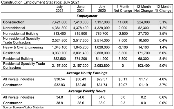 The nation’s construction industry added 11,000 jobs on net in July, according to an Associated Builders and Contractors analysis of data released today by the U.S. Bureau of Labor Statistics. Overall, the industry has recovered 886,000 (79.6%) of the jobs lost during earlier stages of the pandemic.