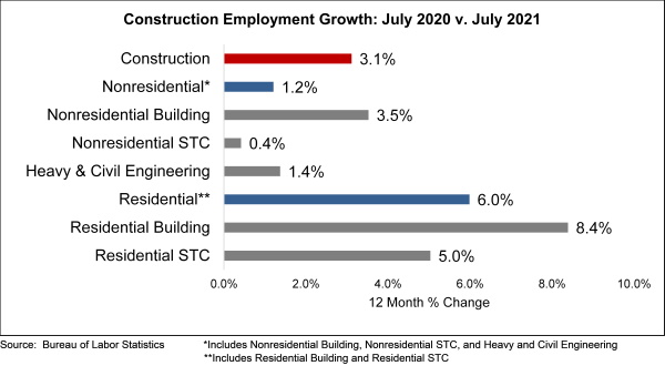 “Some of the capital that investors seek to deploy is invested in real estate, which translates into additional construction work,” said Basu. “While construction of new structures remains suppressed in a number of segments like lodging and office due to the dislocating effects of the COVID-induced downturn, there is considerable work underway in terms of modernizing existing structures. That helps explain why nonresidential specialty trade contractors added thousands of jobs last month while general contractors did not.”