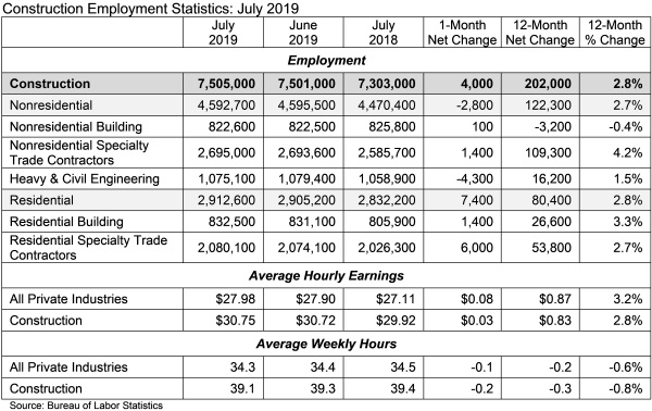 The construction industry added 4,000 net new jobs in July, according to an Associated Builders and Contractors analysis of data released today by the U.S. Bureau of Labor Statistics. On a year-over-year basis, industry employment has expanded by 202,000 net jobs, an increase of 2.8 percent.