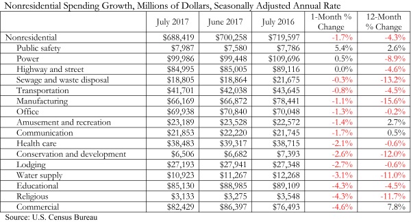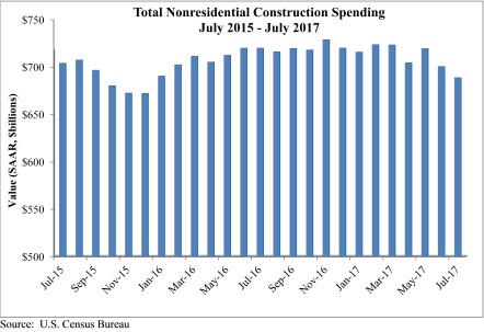 Nonresidential construction spending fell 1.7 percent in July, totaling $688.4 billion on a seasonally adjusted, annualized basis, according to an analysis by Associated Builders and Contractors (ABC) of data released today by the U.S. Census Bureau. The absolute level of nonresidential construction spending was at its lowest point since December 2015.
