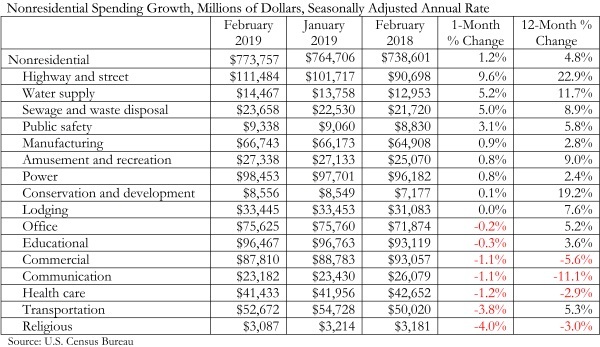 Private nonresidential spending fell 0.5 percent for the month and is only up 0.1 percent on a year-over-year basis. Public nonresidential spending is up 3.7 percent for the month and an impressive 12.1 percent for the year. Highway and street (+9.6 percent), water supply (+5.2 percent) and sewage and waste disposal (+5 percent) spending experienced the largest monthly increases in February, while religious (-4 percent) and transportation (-3.8 percent) spending experienced the largest decreases.