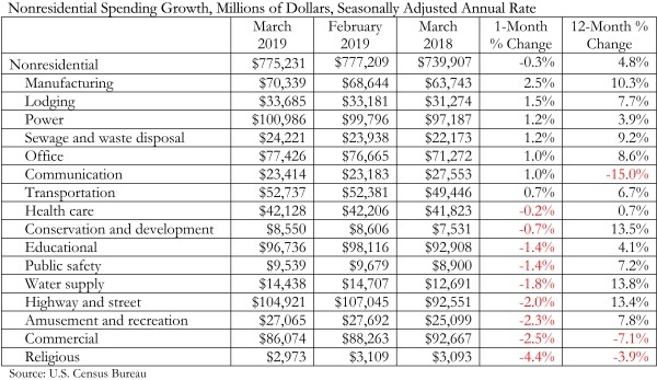 According to an Associated Builders and Contractors analysis of U.S. Census Bureau data released today, national nonresidential construction spending declined 0.3 percent in March 2019. On a seasonally adjusted, annualized basis, nonresidential spending totaled $775.2 billion for the month, which represents a 4.8 percent increase compared to the same time last year.