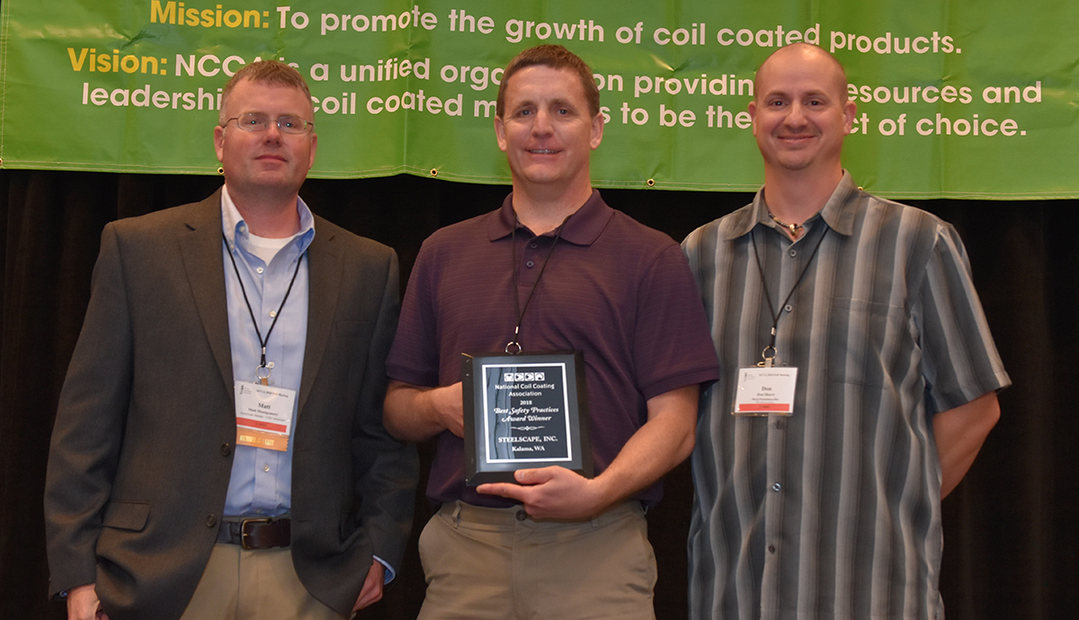 The National Coil Coating Association (NCCA) presented its 2018 Safety Award to Steelscape representatives from the facility in Kalama, Washington, at NCCA’s Fall Technical Meeting in Louisville on September 26.