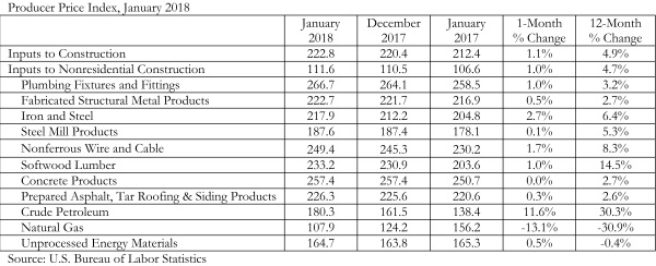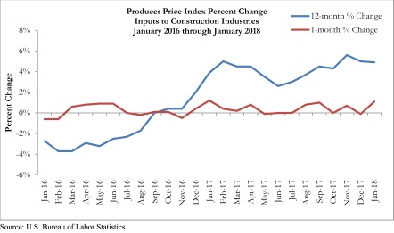 Overall construction input prices increased 1.1 percent in January, reversing a slight decline in December 2017, according to an Associated Builders and Contractors (ABC) analysis of Bureau of Labor Statistics data released today. Compared to this time last year, overall construction materials prices are up 4.9 percent. Nonresidential construction materials prices are up 4.7 percent year over year and up 1 percent on a monthly basis.