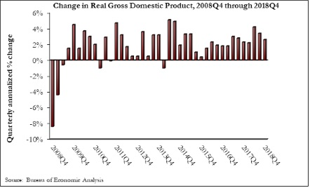 “Undoubtedly, some attention will be given to the fact that the U.S. economy expanded by just shy of 3 percent in 2018,” said Basu. “Unless that figure is revised upward in subsequent releases, it will mean that America has failed to reach the 3 percent annual threshold since 2005. But while much attention will be given to a perceived shortfall in growth, the fourth quarter figure of 2.6 percent signifies that the U.S. economy entered this year with substantial momentum. Were it not for a weak residential construction sector, 3 percent growth would have been attained. Moreover, the data indicate strength in disposable income growth and in business investment.”